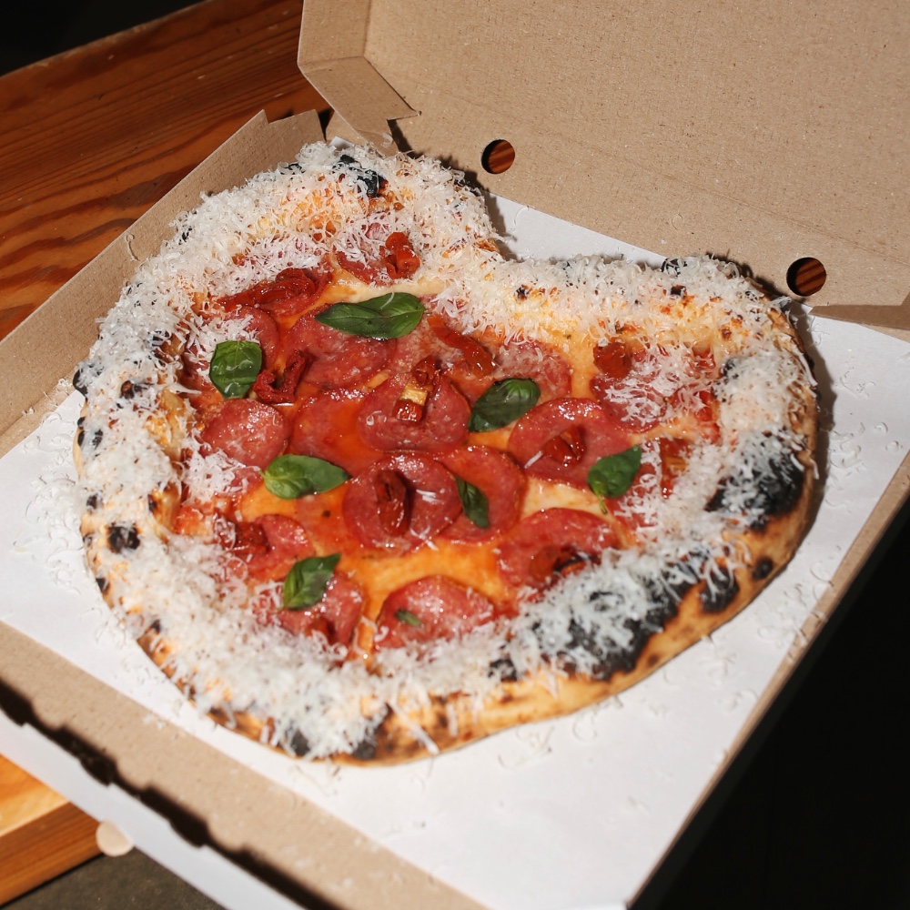 томатний соус, моцарела, салямі, халапеньйо, пластівці чилі, в’ялена вишня