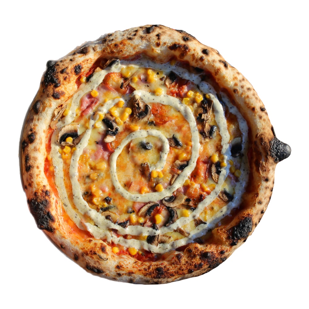 соус томатний, моцарела, шинка копчена, печериці, кукурудза, трюфельний соус